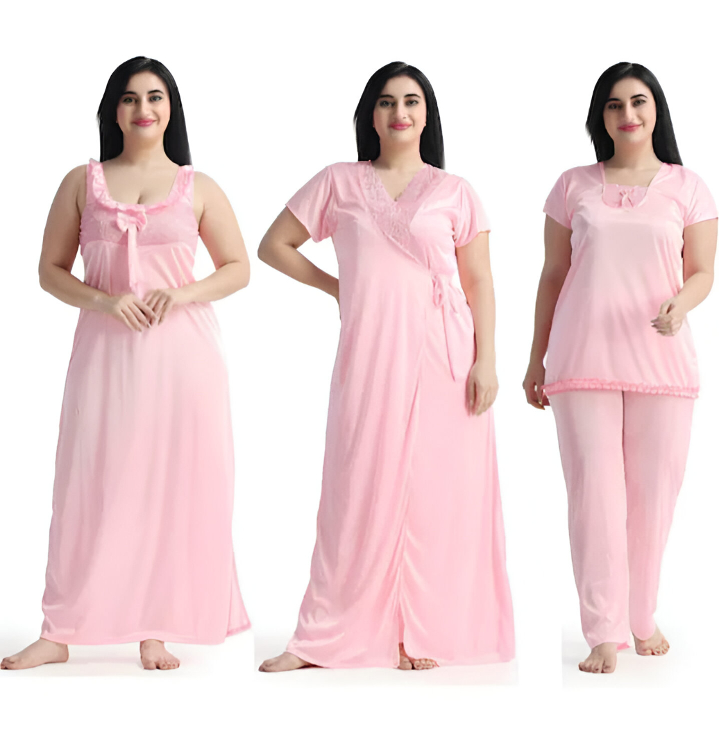 Add a touch of luxury and elegance to your wardrobe with this 4-Piece Women’s Satin Nightwear Set. Designed with soft satin fabric and delicate lace/net work, this nightwear is the perfect combination of sexy, stylish, and comfortable.