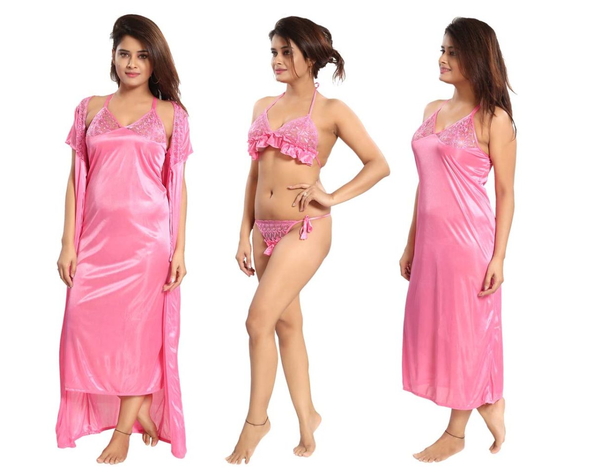 Add a touch of luxury and elegance to your wardrobe with this 4-Piece Women’s Satin Nightwear Set. Designed with soft satin fabric and delicate lace/net work, this nightwear is the perfect combination of sexy, stylish, and comfortable.