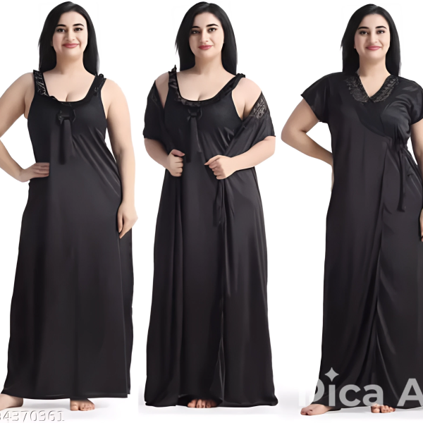 Black – Women’s 4-Piece Satin Nightwear Set – Night Robe, Slip & Lingerie | Free Size
