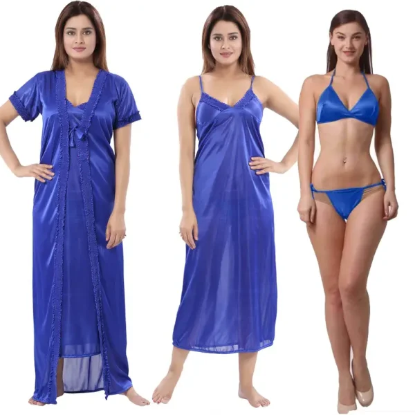 Blue – Women’s 6-Piece Satin Nightwear Set – Night Robe, Slip & Lingerie | Free Size
