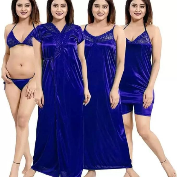 Blue – Women’s 4-Piece Satin Nightwear Set – Night Robe, Slip & Lingerie | Free Size