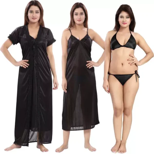 Black – Women’s 6-Piece Satin Nightwear Set – Night Robe, Slip & Lingerie | Free Size