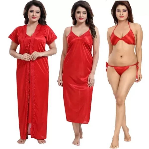 Maroon – Women’s 4-Piece Satin Nightwear Set – Night Robe, Slip & Lingerie | Free Size